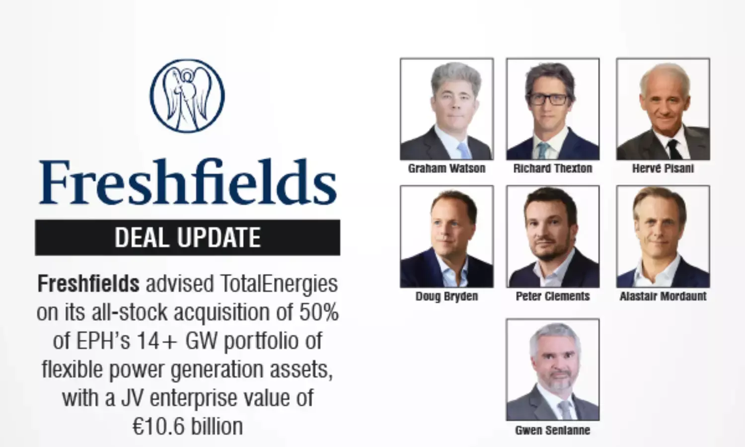 Freshfields advised TotalEnergies on its all-stock acquisition of 50% of EPH’s 14+ GW portfolio of flexible power generation assets, with a JV enterprise value of €10.6 billion