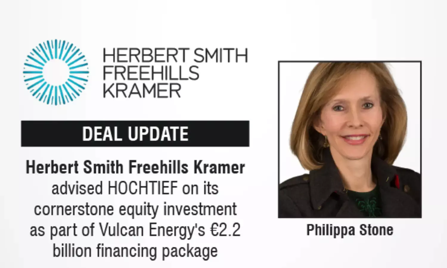 Philippa Stone said, "We are delighted to have acted for HOCHTIEF as it supports Vulcan Energy on this transformative funding package and moves toward construction and development of Vulcan Energy’s Phase One Lionheart Project."