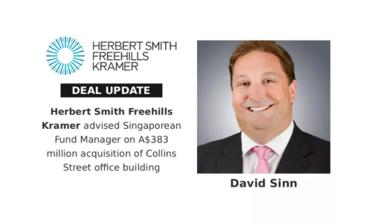 Herbert Smith Freehills Kramer advised Singaporean Fund Manager on A$383 million acquisition of Collins Street office building