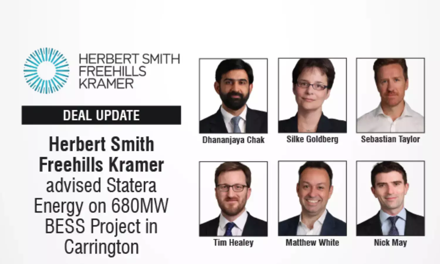 Leading global law firm Herbert Smith Freehills Kramer has advised Statera Energy as lead borrower counsel on its 680MW Battery Energy Storage System (BESS) project in Carrington, near Manchester, England. The firm advised on project financing, hedging, route to market, regulatory, floor arrangements, real estate, planning and diligence aspects.