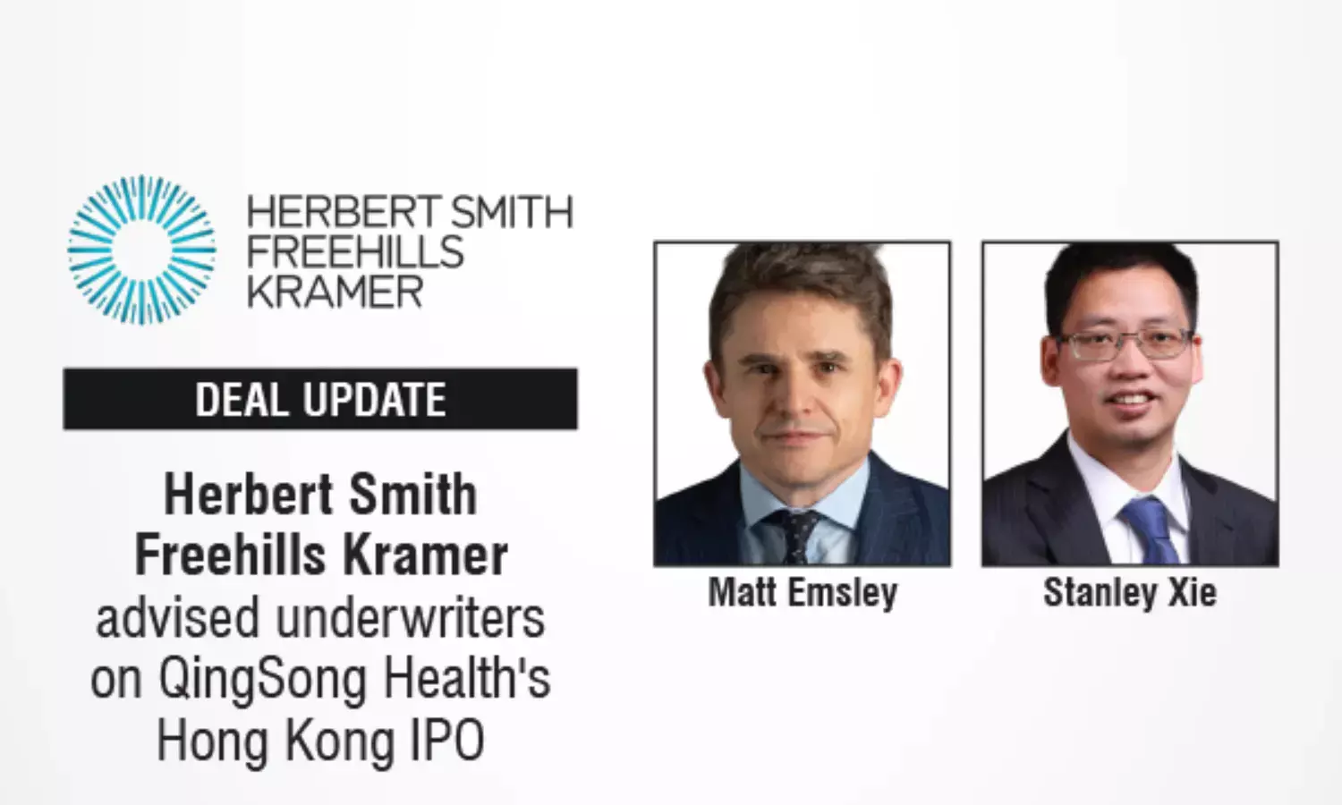Leading global law firm Herbert Smith Freehills Kramer has advised China International Capital Corporation Hong Kong Securities Limited and China Merchants Securities (HK) Co., Limited as underwriters on QingSong Health Corporation (02661.HK)'s listing on the Main Board of the Hong Kong Stock Exchange.