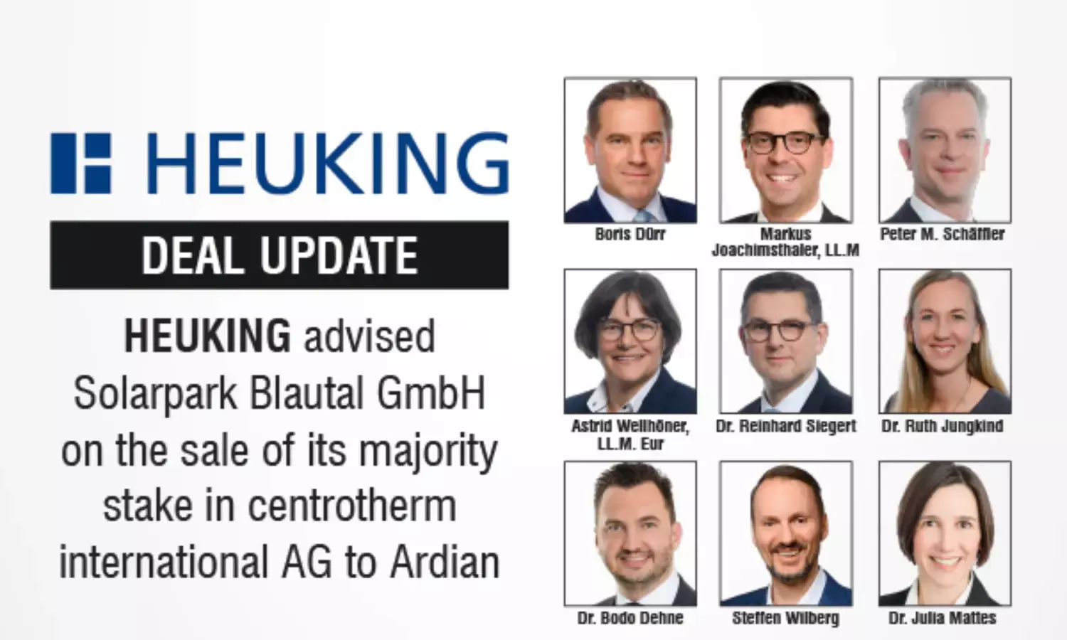 HEUKING advised Solarpark Blautal GmbH (“SPB”) on the sale of its 90% stake in stock-listed centrotherm international AG (“centrotherm”) to private equity Investor Ardian. Ardian acquired the majority stake in centrotherm via Ardian Semiconductor, an innovative private equity platform focused on investments in the semiconductor industry. As part of the transaction, SPB will reinvest a significant portion of its sale proceeds and will thereby retain an indirect stake of approximately 39.5% in centrotherm. Following the requisite merger clearance, the transaction closed on December 17, 2025. The parties agreed not to disclose further details, in particular the purchase price.