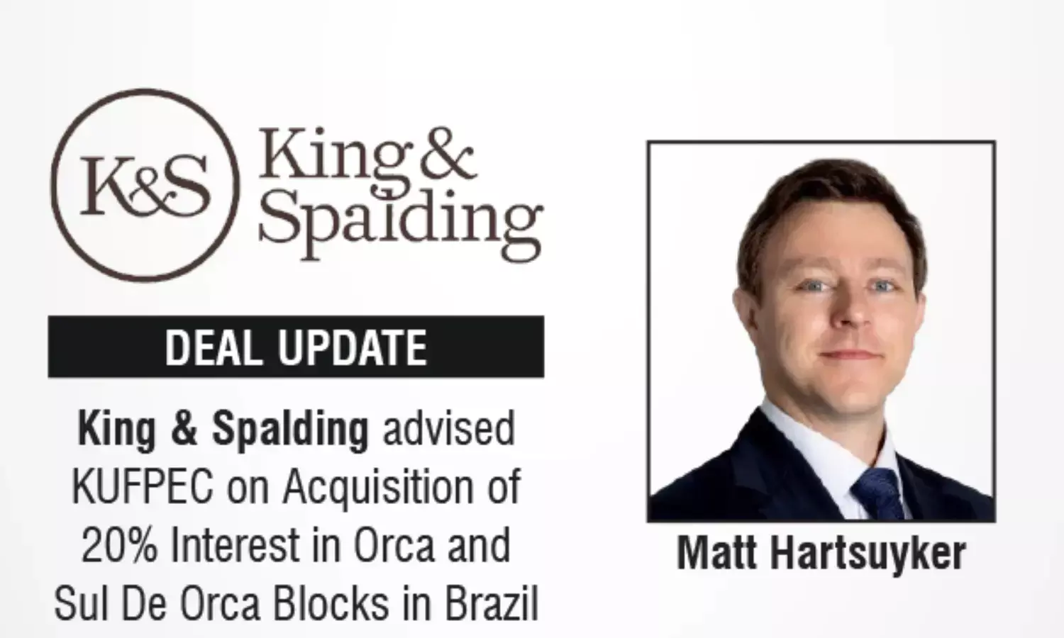 The global law firm, King & Spalding advised Kuwait Foreign Petroleum Exploration Company, k.s.c.c. (KUFPEC) on its agreement to acquire a 20 percent interest in the Orca and Sul De Orca oil and gas assets in Brazil from Shell Brasil Petróleo Ltda, a wholly owned subsidiary of Shell Plc. The transaction remains subject to requisite regulatory approvals.