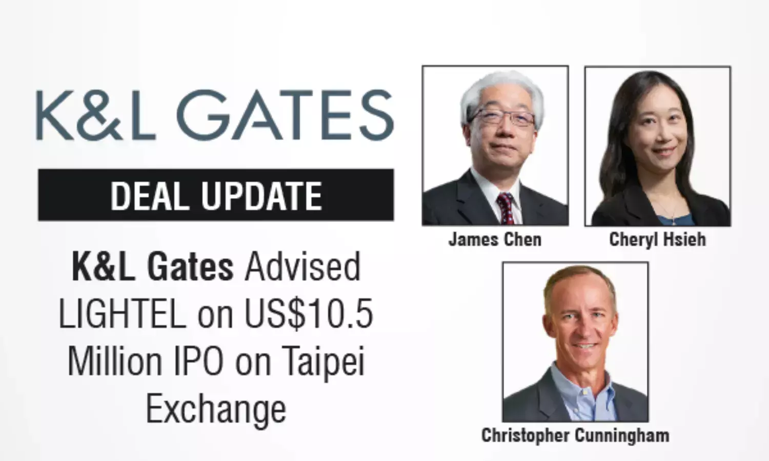 The K&L Gates team was led by that advised LIGHTEL on the listing by Taipei (Partner), James Chen (Partner), Cheryl Hsieh (Partner), Christopher Cunningham (Partner), and Albert Wang (Counsel) .