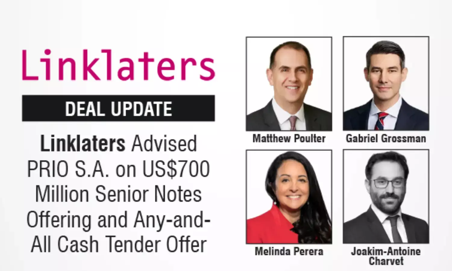 Linklaters' work also included advised PRIO S.A. on a concurrent any-and-all cash tender offer that resulted in the repurchase of US$431 million of its previously issued 6.125% senior secured notes due 2026.