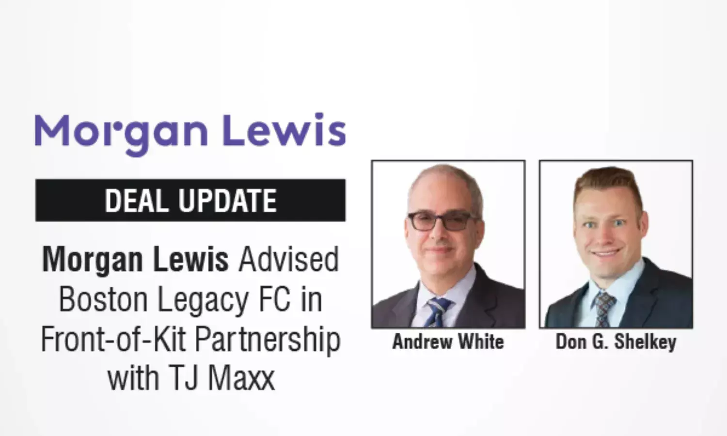 The Morgan Lewis team was led by Andrew White (Partner), Don G. Shelkey (Partner), and Jesse Taylor (Associate), advised Boston Legacy FC.