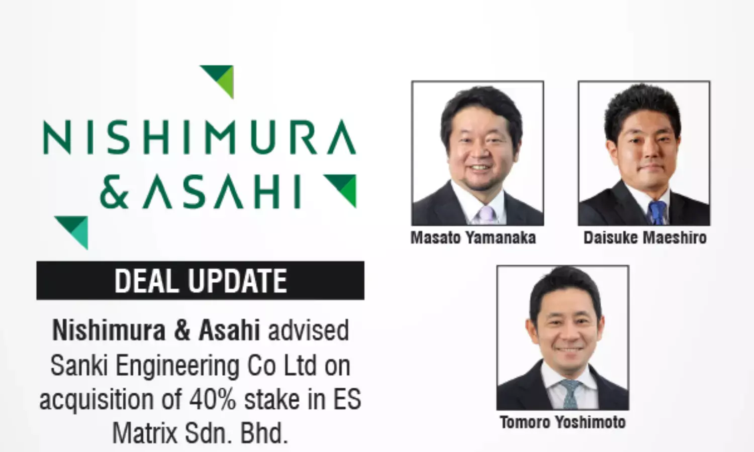 The leading international law firm in Japan, Nishimura & Asahi advised Sanki Engineering Co Ltd on its acquisition of 40% of the shares of ES Matrix Sdn. Bhd. The transaction marks a strategic investment by Sanki Engineering aimed at strengthening its presence and collaboration in the regional engineering and infrastructure sector.
