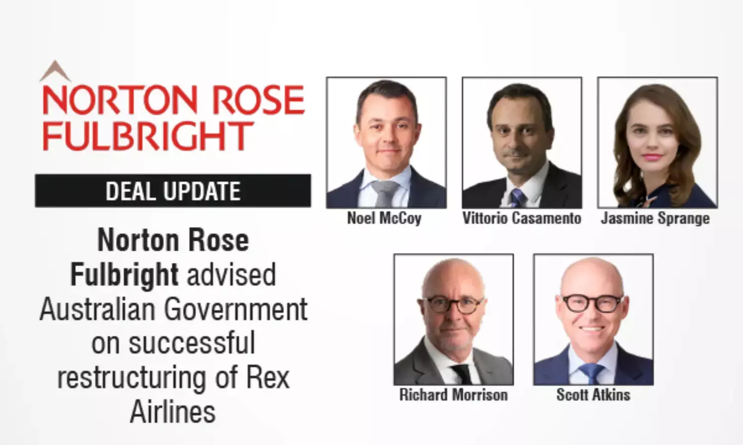 “We are pleased to have brought together a multidisciplinary team to assist the Australian Government in its successful restructure of Rex Airlines. Rex has played an important role in meeting the travel needs of regional and remote Australians, and we are delighted to have supported the Australian Government’s efforts to ensure that these valued aviation services can continue.”