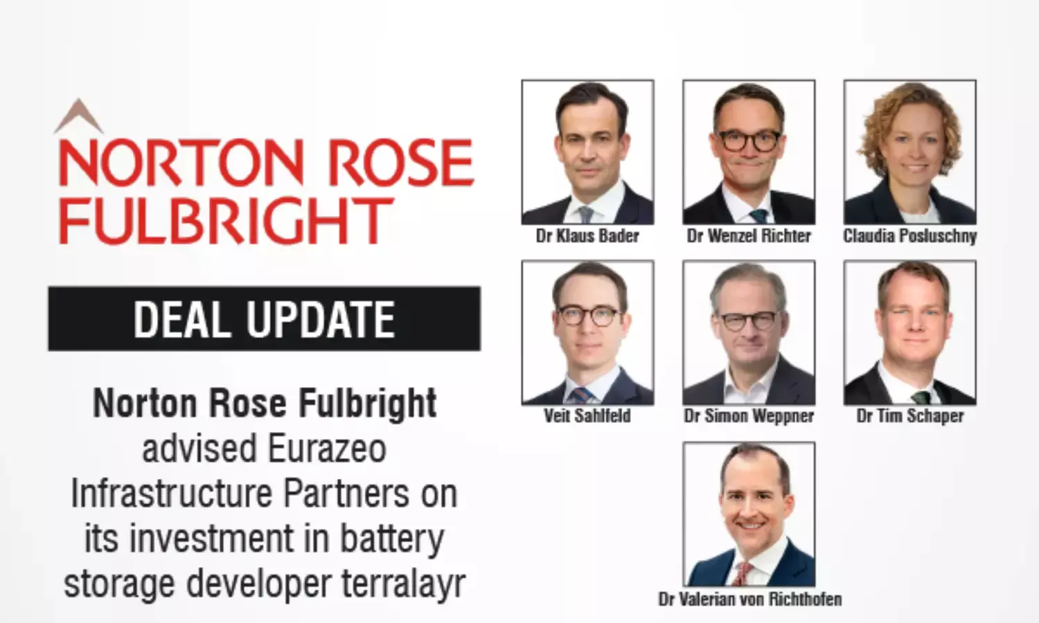 Global law firm Norton Rose Fulbright has advised Eurazeo Infrastructure Partners (EIP) on an investment in battery storage developer terralayr AG. Together with the existing investors, EIP will provide growth capital to terralayr of up to EUR 192 million to enable the further expansion of its portfolio of battery storage systems across the DACH region.