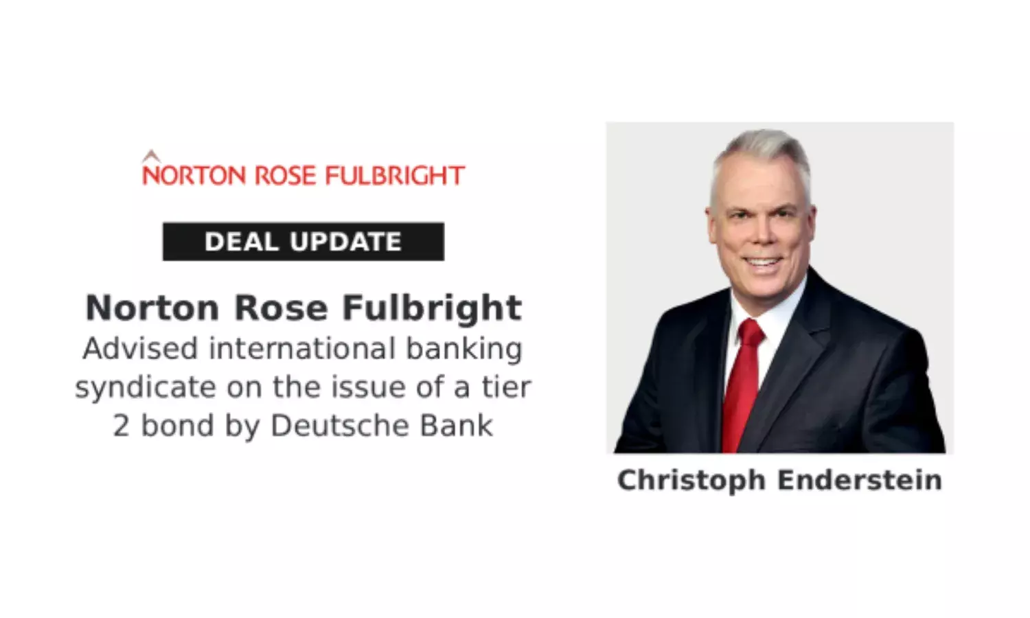 Enderstein, who is also responsible for Norton Rose Fulbright’s debt capital markets practice in Germany, said, "My team and I have previously advised in connection with various capital markets transactions of Deutsche Bank. We are pleased that Deutsche Bank again placed its trust in our team in connection with the issue of its new tier 2 bond."