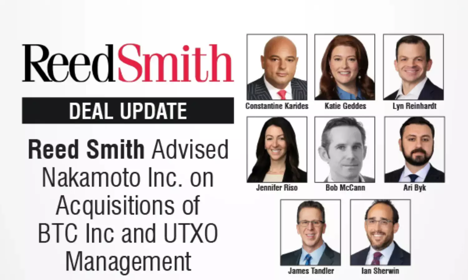 Global law firm Reed Smith represented Nakamoto Inc. in its mergers with BTC Inc and UTXO Management GP, LLC. Nakamoto financed