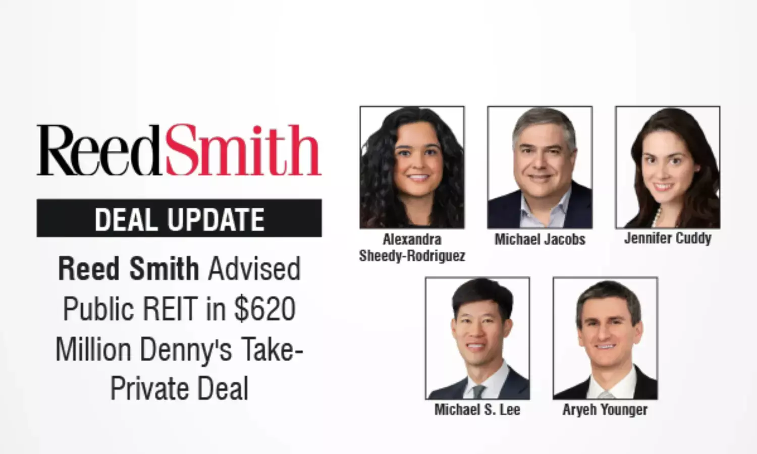 Global law firm Reed Smith advised a public real estate investment trust (REIT) on its acquisition of a nationwide portfolio of restaurant properties as part of a $620 million take-private acquisition of Denny's Corp. The transaction closed in the first quarter of 2026 and required the Reed Smith team to perform expedited due diligence on over seventy properties during a two-week review period. Reed Smith provided advised on various real estate, state tax, corporate and franchise issues.