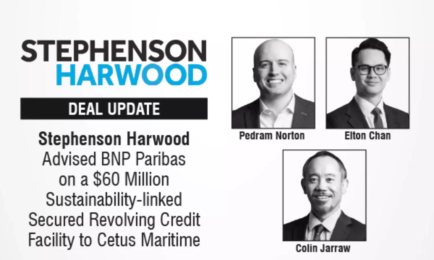 Stephenson Harwood has advised BNP Paribas on a US$60 million sustainability-linked, secured revolving credit facility (RCF) to Cetus Maritime group, a handysize dry bulk owner and operator.