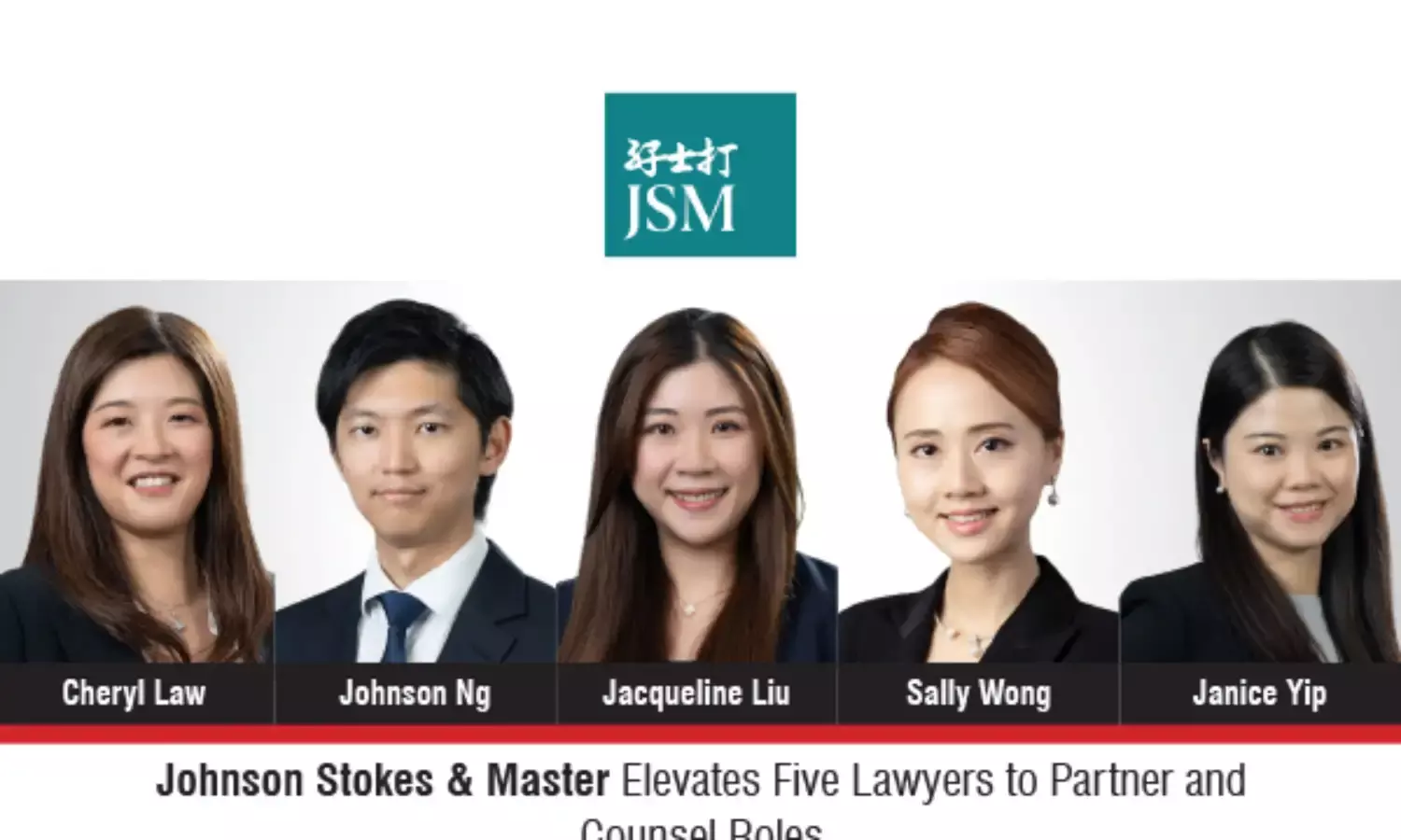 The Hong Kong-based law firm Johnson Stokes & Master (JSM) has announced the promotion of five lawyers to partner and counsel, effective 1 January 2026. The promotions include Cheryl Law and Johnson Ng as partners, and Jacqueline Liu, Sally Wong, and Janice Yip as counsel. This marks the firm’s second round of promotions since its relaunch on 2 December 2024, reflecting JSM’s commitment to nurturing talent and recognising professional excellence.