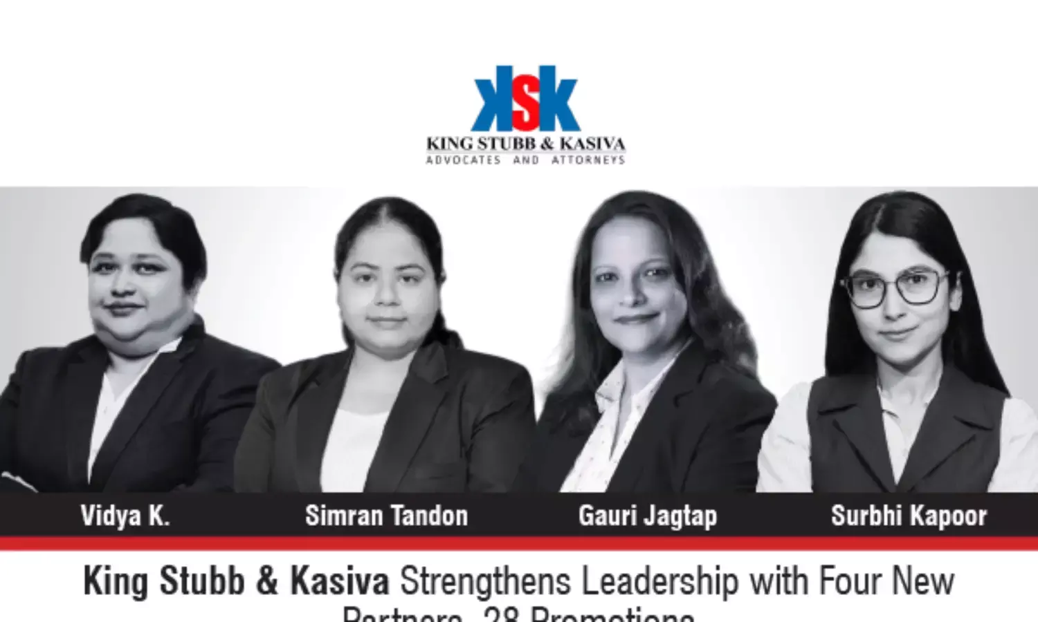 The leading Indian full-service law firm, King Stubb & Kasiva (KSK) has announced its annual promotions, elevating four lawyers to the position of Partner and promoting 28 other professionals across various roles within the firm.