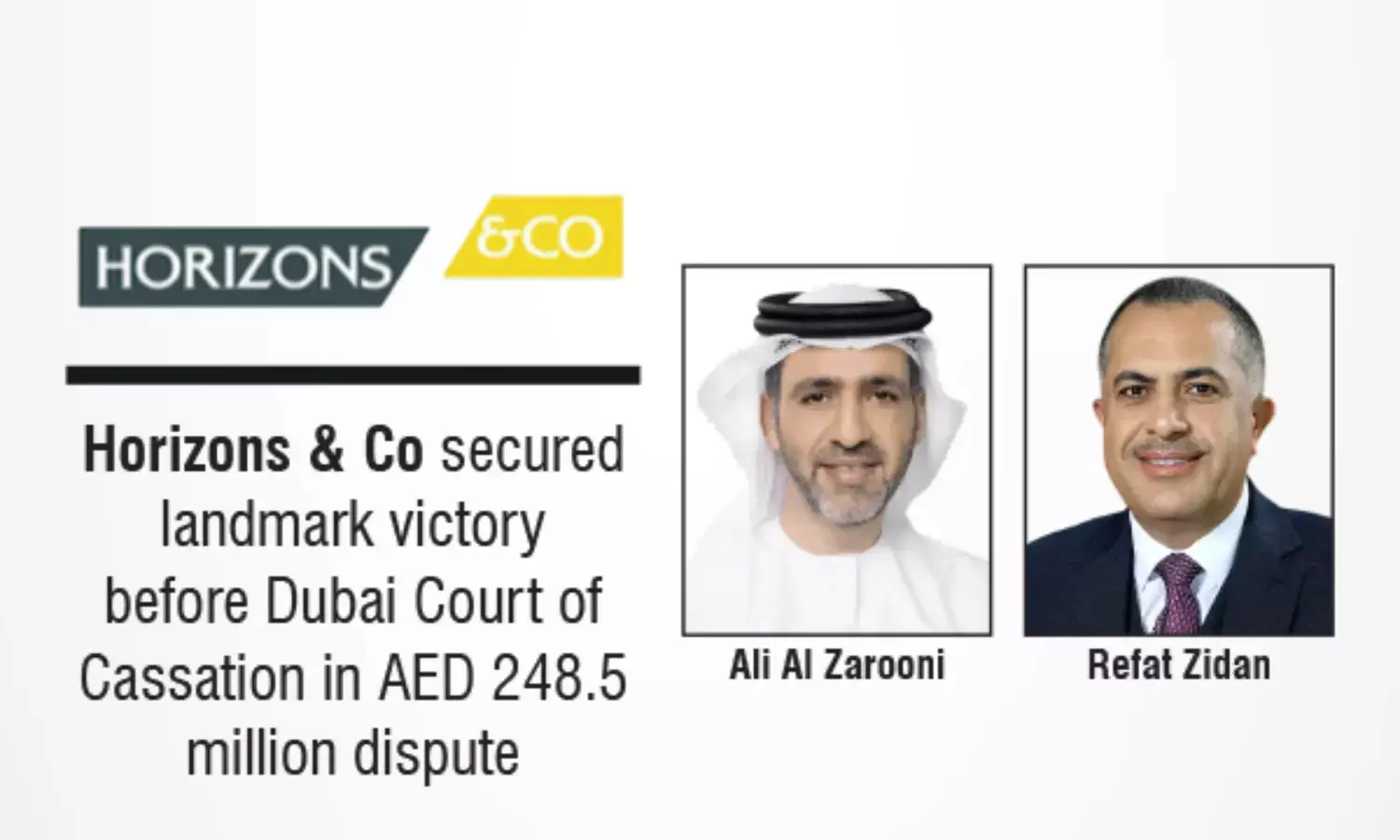 The Horizons & Co team was led by Ali Al Zarooni (Managing Partner) and Refat Zidan (Head of Litigation), with support from Tania Antoun (Senior Associate).