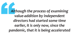 The current pandemic, which has challenged businesses like never before, has also got them thinking about the quality of their board of directors. Although the process of examining value-addition by independent directors had started some time earlier, it is only now, since the pandemic, that it is being accelerated. It is understood that in some cases, with valuable suggestions not always forthcoming from board members, CEOs have been all at sea in these unprecedented times. The pandemic has taken board members of several companies by surprise leading to lack of appropriate guidance to CEO by board members. Several promoters do not see much value addition from board members in this turbulent time. Several others are considering positioning internal talent as directors on the board rather than looking for external members to fill in the vacancies. Companies are increasingly looking to bring on board people who can be an adviser to the CEO. It is because not many board members may have the experience of dealing with a COVID like pandemic. Today promoters are increasingly looking for independent directors who have dealt with crisis/change management/turnaround scenario/ unprecedented situations and who also can challenge conventional thinking. "An independent director must be willing to challenge managerial proposals and ask the critical questions that nobody else is asking"-said recently by a CEO of a fortune five hundred company. The independent board's role of being a devil's advocate can be challenging. In the words of Peter Drucker "if everyone agrees with a decision without challenge, it probably is the wrong decision".