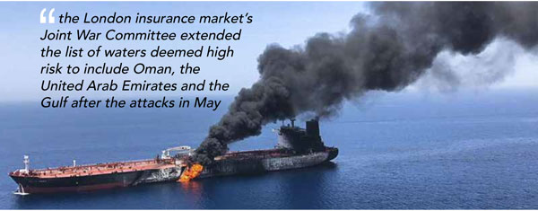 Annual war-risk is one of several forms of insurance a vessel obtains while sailing into high-risk regions. Recently, it has been reported that the London insurance market's Joint War Committee extended the list of waters deemed high risk to include Oman, the United Arab Emirates and the Gulf after the attacks in May. Therefore, any vessels calling for bunkering in these ports will suffer high premiums.