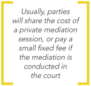 Usually, parties will share the cost of a private mediation session, or pay a small fixed fee if the mediation is conducted in the court (about $250.00 at the time of this article). The cost includes the mediator's fees, as well as rental fees for the meeting room. For private mediation, the cost usually does not exceed $10,000.00 for a single-day session. (Do note that lawyers charge their fees separately for preparation and attendance.)