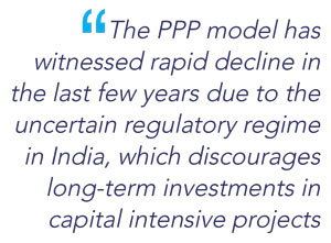 Investment through the PPP route saw unprecedented growth in 2004-20111. During this period, the Government of India streamlined the appraisal and Government approval process, introduced the viability gap funding scheme and set up national level funds to stabilize the financial flexibility of private investors. However, in recent years, the PPP mode has witnessed rapid decline in being able to keep the private players' interests alive. The decline is due to various reasons which include, aggressive bidding due to inadequate risk assessment by private players which has led to increased failure of projects during operation stage, financing issues specially lack of equity leading to stalled projects and an overall slowdown in roll out of PPP projects by the Government. Additionally, an important factor which continues to discourage the long-term investments in capital intensive projects is the uncertain regulatory regimes in India.