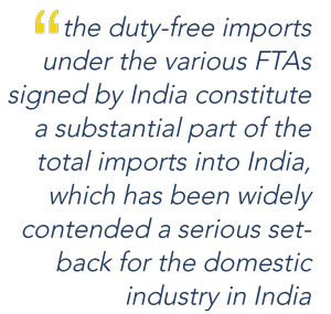 India is currently negotiating FTAs with European Free Trade Agreement ("EFTA"), EU, Australia, and New Zealand, among others. India was also a negotiating partner in the mega regional agreement (yet to be concluded)- the Regional Comprehensive Economic Partnership ("RCEP"). However, it seems India has taken a step back in the negotiations, due to a failure of the final texts to tackle its trade concerns. With the changing global landscape, India has been moving towards a more protectionist form of trade governance. As per WTO data, the average applied MFN tariff rate for India is 17.1%, and trade weighted average rate is 11.7%1, which is much higher than its counter-parts. Further, only 9.8% of the imports are MFN duty-free.2 On the other hand, the duty-free imports under the various FTAs signed by India constitute a substantial part of the total imports into India, which has been widely contended a serious set-back for the domestic industry in India.