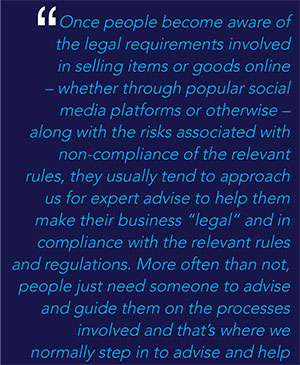 In our experience, once people become aware of the legal requirements involved in selling items or goods online – whether through popular social media platforms or otherwise – along with the risks associated with non-compliance of the relevant rules, they usually tend to approach us for expert advise to help them make their business "legal" and in compliance with the relevant rules and regulations. More