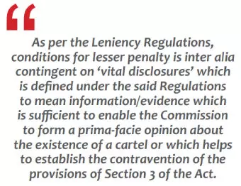 It is noteworthy that as per the Leniency Regulations, conditions for lesser penalty is inter alia contingent on 'vital disclosures' which is defined under the said Regulations to mean information/evidence which is sufficient to enable the Commission to form a prima-facie opinion about the existence of a cartel or which helps to establish the contravention of the provisions of Section 3 of the Act. What should be kept in mind is that the leniency provision prescribed under the Act read with the Regulations is what former CCI Chairperson D.K. Sikri describes as "fantastic" for enforcement actions against cartels. Even in countries where Antitrust laws are more developed compared to India, leniency regimes are the foremost tool for cartel detection. As is evident from all the leniency orders passed by the CCI, the disclosures made by the applicants are enabling it to recognize and penalize anti-competitive forces like cartels in the market. With every passing order, the market players are becoming increasingly aware of the benefits of the leniency regime which works on the touchstone of incentivization. Thus, for the incentive to be evident to an applicant, such that he comes forward to make disclosures, it is imperative that the CCI makes its incentivization approach clear and uniform.