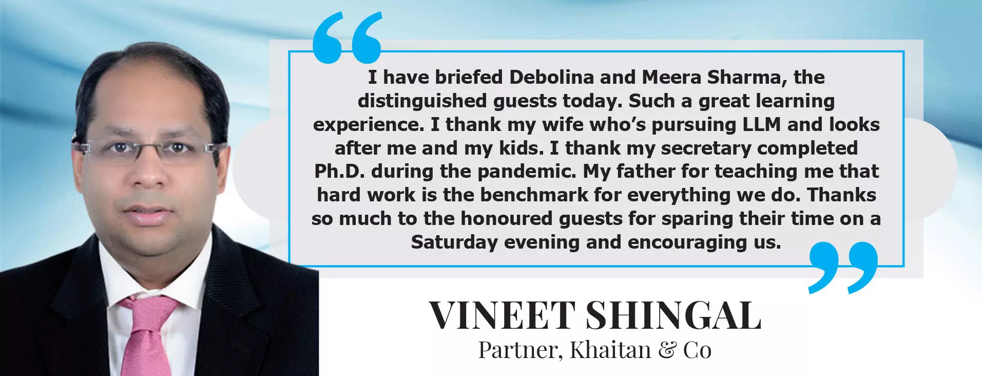 Debolina Partap, Senior Vice President Legal & Group General Counsel, Wockhardt Group gave a spirited address and specially highlighted how performing and excelling as 40 under 40 was such a difficult proposition. Using an analogy with the components of a sandwich, she said "The lawyers under 40 are the dressing and the filling of a sandwich. The GCs can do without them. The juniors cannot do without them. The seniors cannot do without them. They are the brilliant bridge. They have to face business, clients. Cannon to the left, cannon to the right and behind them – they have to fight so well- these people really face that day in and day out. They are the foot soldiers without whom the generals would not have performed.