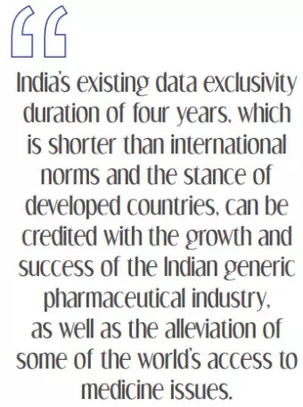 The crux of this debate is determining how long data exclusivity should last to strike a balance between incentivizing creativity and allowing generic manufacturers to offer cheaper alternatives. To this end, India's existing data exclusivity duration of four years, which is shorter than international norms and the stance of developed countries, can be credited with the growth and success of the Indian generic pharmaceutical industry, as well as the alleviation of some of the world's access to medicine issues.