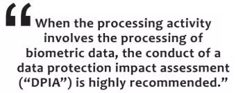 Moreover, when the processing activity involves the processing of biometric data, the conduct of a data protection impact assessment ("DPIA") is highly recommended (EDPB, Guidelines on DPIA, WP 248 rev.01, see also Guidelines 3/2019 on processing of personal data through video devices).