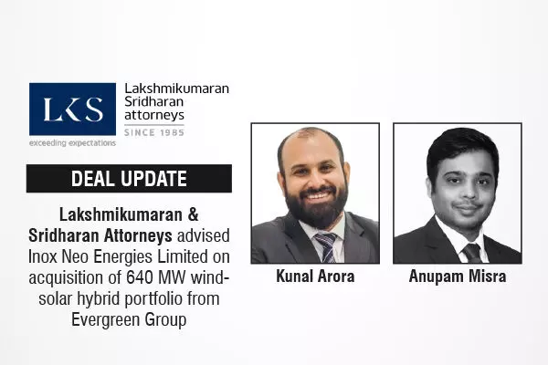 The full-service Indian law firm, Lakshmikumaran & Sridharan Attorneys (LKS) has advised Inox Neo Energies Limited (“Inox”), an independent power producer of the InoxGFL Group and subsidiary of Inox Clean Energy Limited, on the acquisition of a 640 MW AC wind-solar hybrid portfolio from the Evergreen Group, a global renewable energy developer.