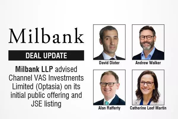 The major global law firm, Milbank LLP advised Channel VAS Investments Limited (trading as “Optasia”) on its initial public offering and listing on the Johannesburg Stock Exchange. The shares were priced at ZAR 19.00, at the top of the price range, raising gross proceeds of approximately ZAR 6.5 billion, assuming the exercise of the overallotment option, and valuing Optasia at approximately ZAR 23.5 billion. This transaction marks the largest IPO in Africa in 2025 and the largest fintech IPO in the EMEA region since 2021.