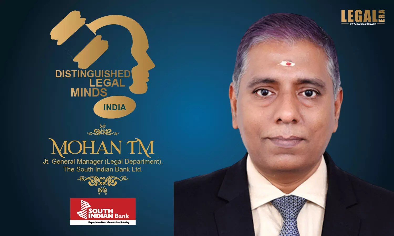 Sir Mohan T M joined The South Indian Bank as a Probationary Legal Officer back in the year 1995 and his consistent and par excellence contribution made him scale heights within the organisation. He climbed the ladder and got promoted to Legal Manager in 2002, Sr. Manager (Legal) in 2006, Chief Manager (Legal) in 2009, Assistant General Manager(Legal) in 2011, Deputy General Manger (Legal) in 2014 and finally Joint General Manager (Legal) in 2019. He has been very efficiently heading Legal Department since 2012.
