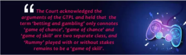 GTPL challenged the show cause notice before the Hon’ble Karnataka High Court, which had quashed and set it aside. The Court acknowledged the arguments of the GTPL and held that the term ‘betting and gambling’ only connotes ‘game of chance’, ‘game of chance’ and ‘game of skill’ are two separate class, and ‘Rummy’ played with or without stakes remains to be a ‘game of skill’. In addition, it was also argued that gaming companies such as GTPL are online intermediaries and only provide facilitation services and are not engaged in supply of ‘actionable claim’.