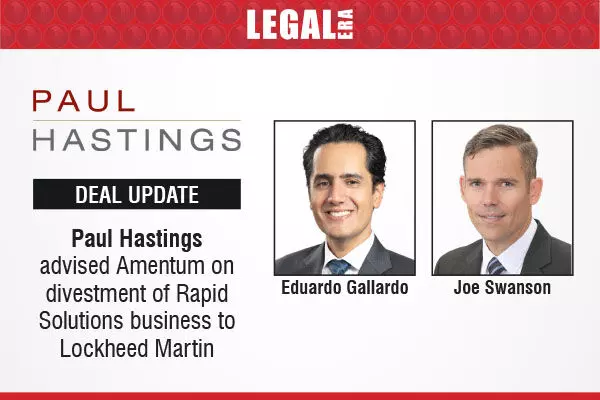 Paul Hastings LLP advised Amentum (NYSE: AMTM) on a definitive agreement to divest its hardware and product business, Rapid Solutions, to Lockheed Martin (NYSE: LMT) for a cash consideration of $360 million.