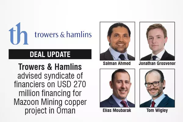 The international law firm with a strong global presence, particularly in the UK, Middle East, and Asia, Trowers & Hamlins advised a syndicate of financiers on a USD 270 million financing provided to Mazoon Mining LLC, a subsidiary of Minerals Development Oman (MDO), for the development of Oman’s largest copper concentrate project.