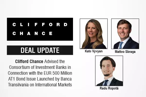 A multijurisdictional Clifford Chance team from London and Bucharest has advised the consortium of investment banks in connection with the EUR 500 million AT1 bond issue launched by Banca Transilvania S.A. on international markets, its first ever such issuance and the largest in Central and Eastern Europe.