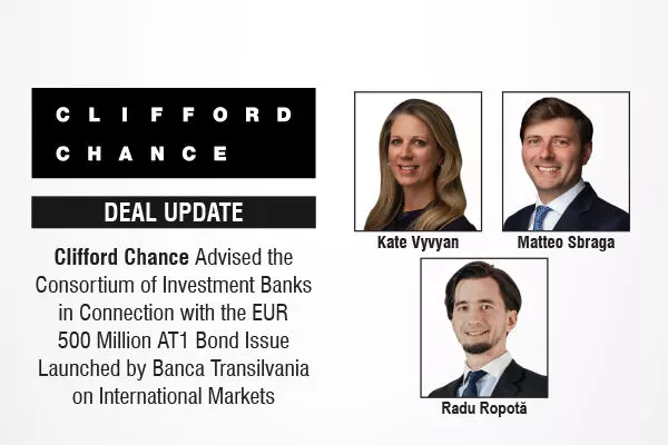A multijurisdictional Clifford Chance team from London and Bucharest has advised the consortium of investment banks in connection with the EUR 500 million AT1 bond issue launched by Banca Transilvania S.A. on international markets, its first ever such issuance and the largest in Central and Eastern Europe.