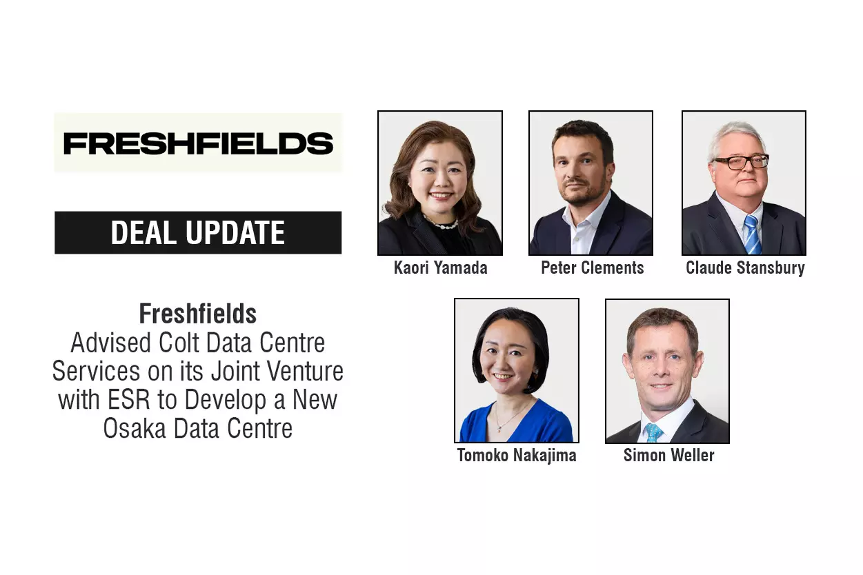 Global law firm Freshfields advised Colt Data Centre Services (“Colt DCS”) on a joint venture with ESR to develop the first phase of a 130 MW hyperscale data centre site in Osaka, Japan. The first phase, comprising 65 MW, will be designed and built by the ESR–Colt DCS joint venture and operated by Colt DCS.