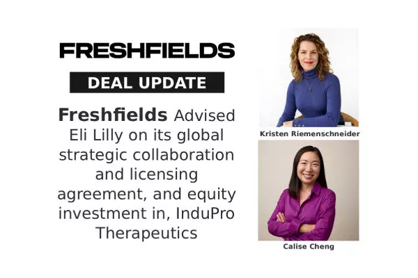 Global law firm Freshfields advised Eli Lilly and Company (“Lilly”) on its global strategic collaboration and licensing agreement, and equity investment in, InduPro Therapeutics (“InduPro”) to discover novel oncology treatments using InduPro’s proximity-guided platform. InduPro is a biotechnology company defining membrane protein spatial relationships to create novel therapeutics for the treatment of cancer and autoimmune diseases.