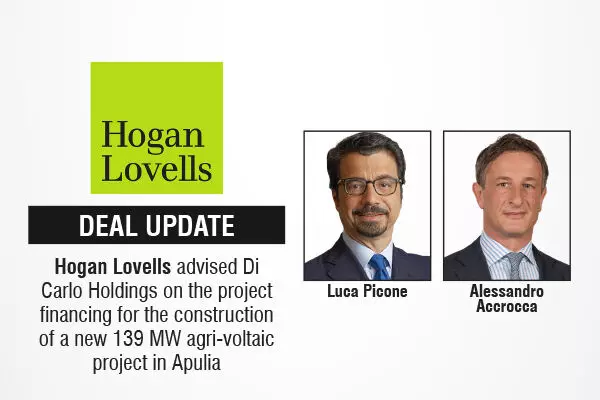 Global law firm Hogan Lovells has advised Di Carlo Holdings (“DCH”), a group active in the renewable energy sector with a focus on agrivoltaics and sustainable innovation, on the project financing for the construction of 14 large scale agri-voltaic plants with an overall capacity of 139 MW and located in Puglia, Italy.