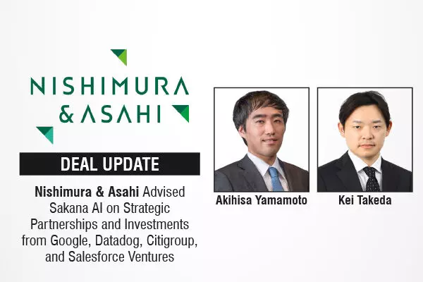 The leading international law firm in Japan, Nishimura & Asahi, advised Sakana AI on a strategic partnership and investment from Google, a strategic partnership from Datadog, Inc. [NASDAQ: DDOG], and a strategic investment from Citigroup [NYSE: C] and Salesforce Ventures LLC.
