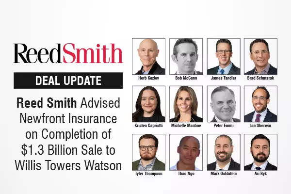 Global law firm Reed Smith advised Newfront Insurance, an insurance brokerage providing risk management, employee experience, and retirement solutions across more than 20 industries, in the completion of its sale to Willis Towers Watson (WTW). The deal is valued at up to $1.3 billion, including upfront and contingent consideration.