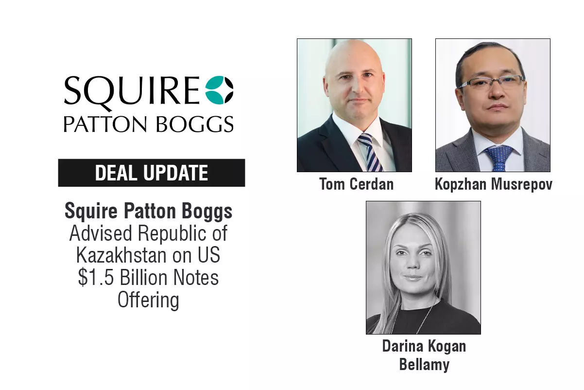 Global law firm Squire Patton Boggs advised the Ministry of Finance of the Republic of Kazakhstan on its benchmark Reg S/144A issue of US$1.5 billion 4.412 per cent Notes due 2030 under its US$15 billion Global MTN programme listed on the London Stock Exchange and the Astana Stock Exchange. The issue attracted strong demand from international investors closing with a final yield of 4.412 per cent and a spread of 85 basis points over US Treasuries.