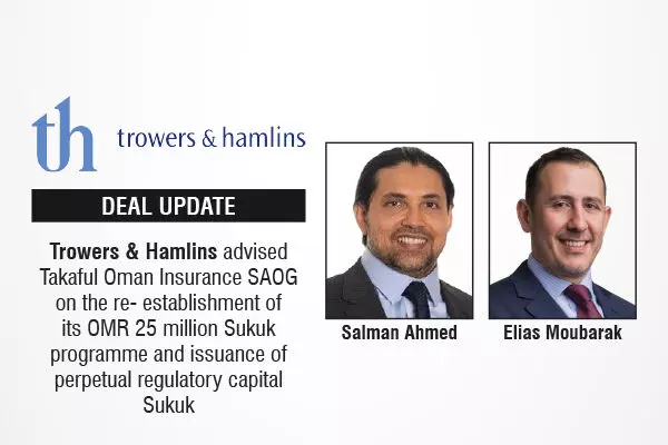 Trowers & Hamlins has advised Takaful Oman Insurance SAOG (Takaful Oman) on the successful re establishment of its OMR 25,000,000 Sukuk Al Mudaraba Trust Certificate Issuance Programme and on the issuance of OMR 6 million 6.75% Sukuk certificates thereunder.