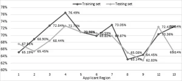 Figure 2 illustrates the accuracy trends in training sets across 11 significant regions. Group 0 comprises 1,661 invention patents with all invalid claims, whereas Group 1 includes 3,642 invention patents with fully or partially valid claims. As shown in Figure 3, the training accuracy for Group 1 ranged from 100% in Region 7 (Beijing) and Region 9 (Shanghai) to 95.95% in Region 1 (US). The average training accuracy for the SVM/RBF model in Group 1 was 98.95%. In contrast, the training accuracy for Group 0 ranged from 23.55% in Region 13 (Overseas-others) to 0.00% in both Region 8 (DE) and Region 7 (Beijing), resulting in an average training accuracy of just 9.78% for this group.