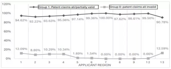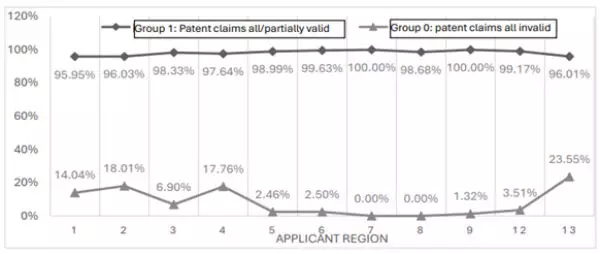 Based on the existing decisions regarding invalidation re-examinations at the China State Patent Office, a total of 8,666 invention patents were categorized into two groups. Group 1 comprised 5,974 cases in which claims were determined to be fully or partially valid, while Group 0 included 2,692 cases where claims were deemed entirely invalid. Subsequently, these 8,666 invention patents, along with Groups 1 and 0, were further divided into sub-groups according to the regions where their invalidation re-examinations were filed, resulting in a reorganization into thirteen major regions.