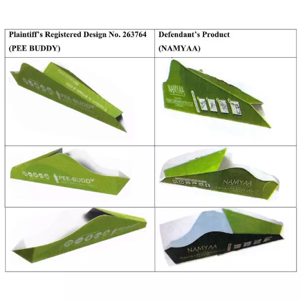 - The Plaintiff, Sirona Hygiene, owned a registered design for a disposable female urination device called “PEE BUDDY”. The company alleged that various sellers on Amazon, including the Defendant under the brand “NAMYAA”, produced and sold nearly identical devices, infringing the Plaintiff’s registered design. Physical samples of both Sirona’s product and the defendant’s allegedly infringing product were presented to the court for comparison which are attached below:
