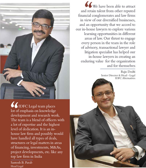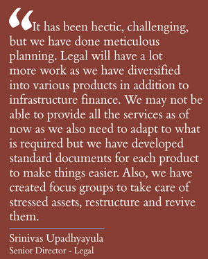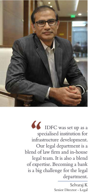 whenever we changed," quipped Dr Uberoi. For the past seven years or so, IDFC had evolved as a full financial sector company. They were of the view that unless an organization updated its offerings and skills, it was difficult to survive. So, apart from their core competency of infrastructure finance, they had steadily diversified into other verticals like private equity, asset management and securities to name a few. Hence, the legal team was geared to take up newer challenges and come up to expectations, even when it came to becoming a bank. Part of this involved upgrading skillsets and the other part implied recruiting people where specialisation was necessary.