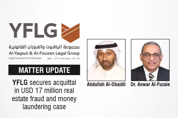 The Kuwaiti corporate law firm, Al-Yaqout & Al-Fouzan Legal Group (YFLG) successfully secured the acquittal of a businessman in criminal proceedings involving allegations of money laundering and real estate fraud amounting to approximately USD 17 million. The acquittal, originally granted by the Criminal Court at first instance, was upheld by the Court of Appeal.